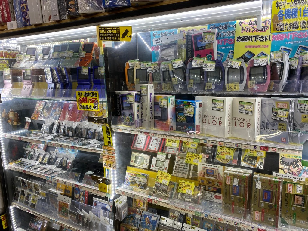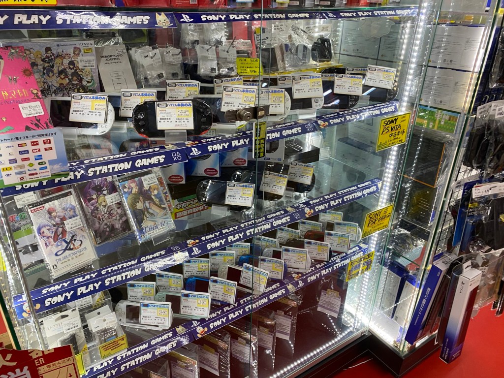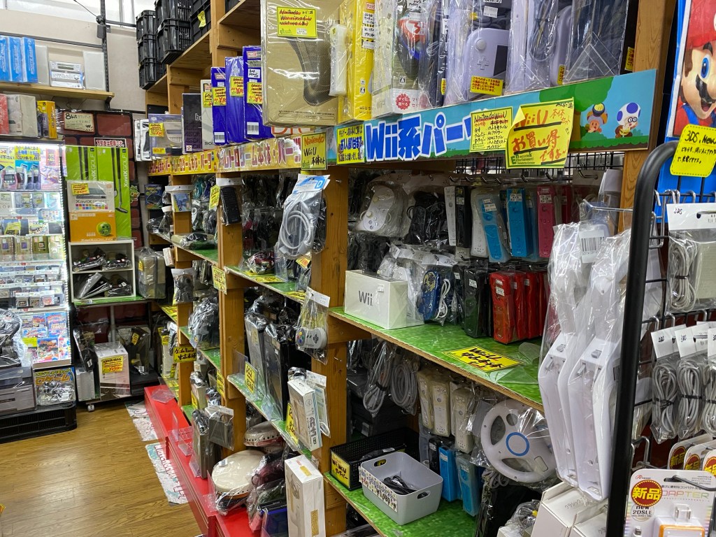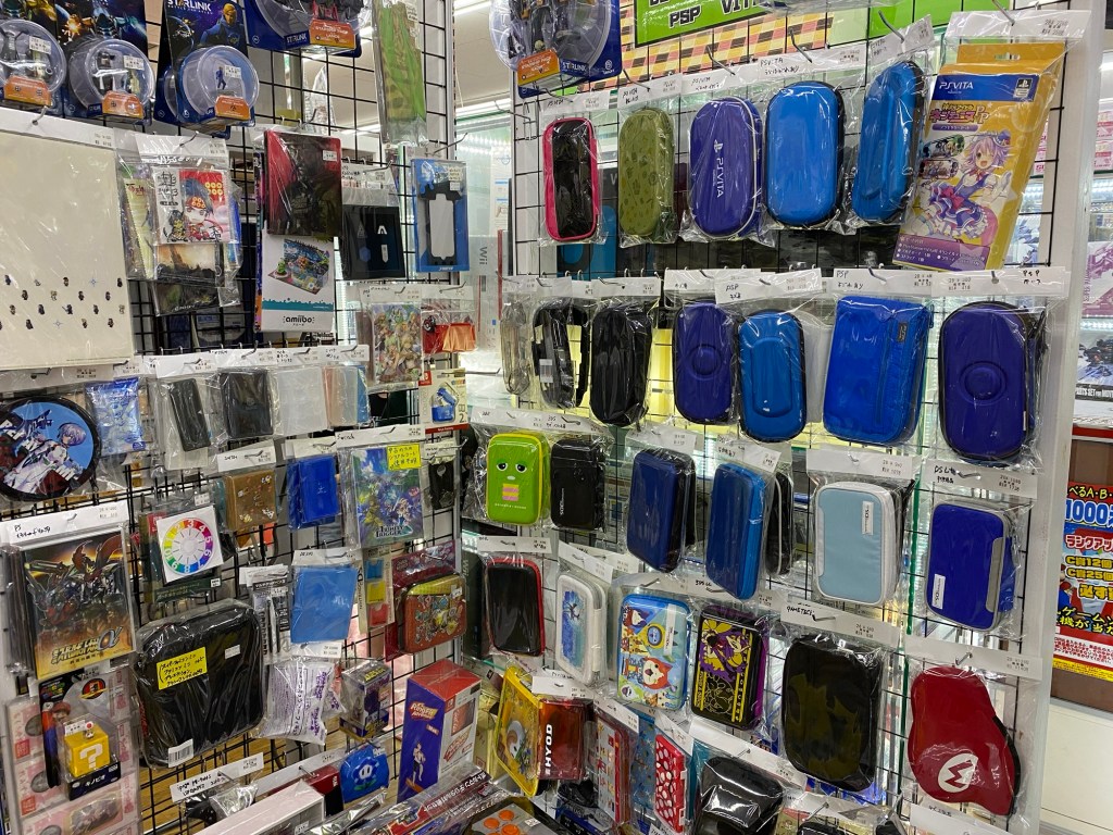 The first picture is what started my Japanese retro gaming adventure back in 2022. I found a cheap Japanese Gamecube without an AV cable or controller for about $28 and said what the heck. I had some Gamecube Controllers already from my American console so I didn’t need to buy any right away, and getting a cable and memory card wasn’t expensive at all. I also picked up copies of Luigi’s Mansion and Animal Crossing on the Gamecube at the time because they were both less than $7 each. All in all, my first purchase cost me less than $60 total. On a subsequent visit a few months later, I picked up some of those cool accessories I was talking about: a The World Ends with You (JP It’s a Wonderful Life) DS Lite cover, a DS Lite carry case, Pikmin 2 for about $8, and a slim black case on the left that eventually became storage for my PS2 slim. I’ve always found good deals at this place and think you’d find good prices here too.