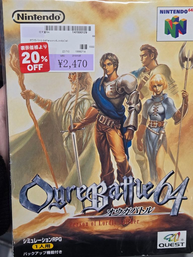 As I stated above, finding loose copies of these games are pretty easy, but boxed ones are a little rarer. Both Ogre Battle and Ocarina of Time were sold out at Super Potato when I went there, but to be honest Ocarina is pretty easy to find boxed. I would say the difficulty is 4 out of 10. Smash Bros. might be closer to 5, and a boxed Ogre Battle is probably around a 6 or 7. It is a bit harder to find them boxed at Hard Offs or Book Offs due to inventories varying wildly between stores. For these prices though, it’s probably worth tracking down boxed copies since they’re so much cheaper than the English versions.