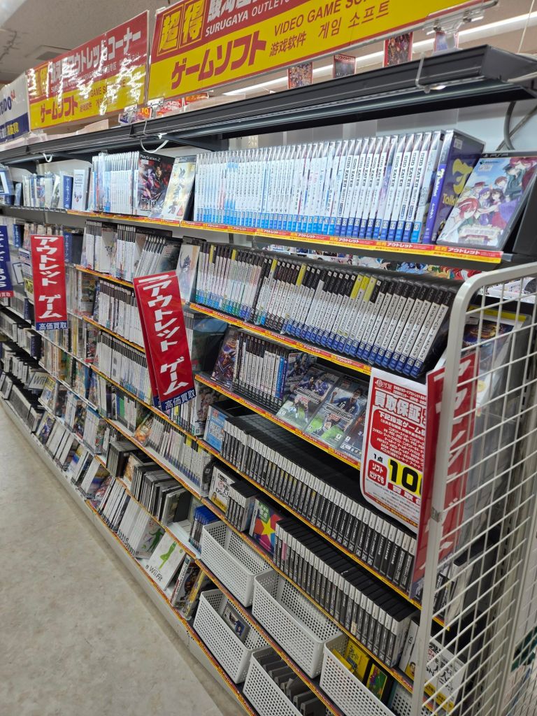 In terms of stock, this branch had even less than the store in Sannomiya, Kobe, but it was still more than what you’d find most Book Offs or Hard Offs. While my pictures above focus on the retro games that this store has, there is actually a good amount of newer games you can find there too. If you add in the Switch, PS4, and PS5 stock, the Takatsuki store is actually pretty big. From a pure retro perspective though, it probably has one of the worst selections I’ve ever seen at a Surugaya. You might have noticed that they only have two glass cases in the pictures above, and that those cases are pretty sparse. I know that most Surugayas don’t usually fill up their cases, but Taktasuki’s cases were kind of sad. Almost no handhelds or consoles in them, and even the shelf with accessories was pretty bare too. The main reason to check out this store would probably be to look through the games on the shelves. They also had a pretty big outlet section.